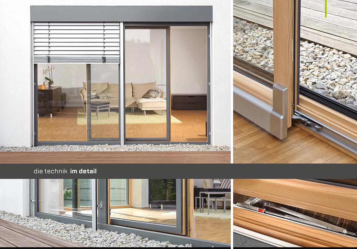PSK-Systeme sind also weniger wuchtig ausgeführt und die Systemtiefe läuft gleich mit unseren Fenstersystemen. Die Bedienung der Schiebe- und Kippfunktion erfolgt über einen 3-fach-Hebelgriff.